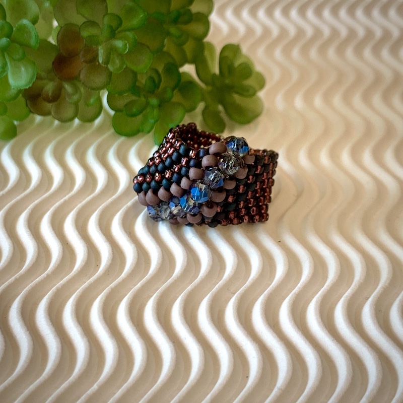 Take your bead weaving up a notch with the Flat Cellini Spiral. This textured design lies flat across your finger, sparkling with crystals and seed beads.